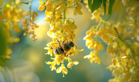 A bee is busy collecting nectar from a cluster of yellow flowers under warm sunlight in a blooming garden. The scene captures the essence of spring and nature's beauty.