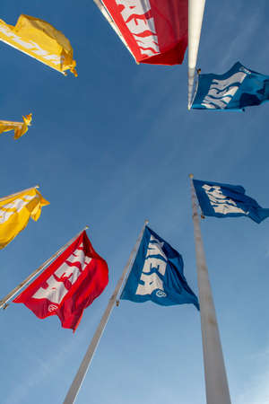 PRAGUE, CZECHIA -APRIL, 2024: Different colors IKEA mass market flags against blue sky.