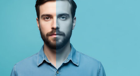 Portrait of a man with half his face in color and the other half in black and white
