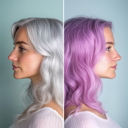 Side by side highlights comparison of the striking transformation from gray hair to vibrant purple, celebrating bold style choices and change.