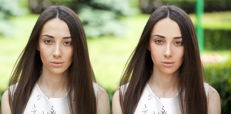 Before and after, retouched picture, portrait of young woman, summer outdoors