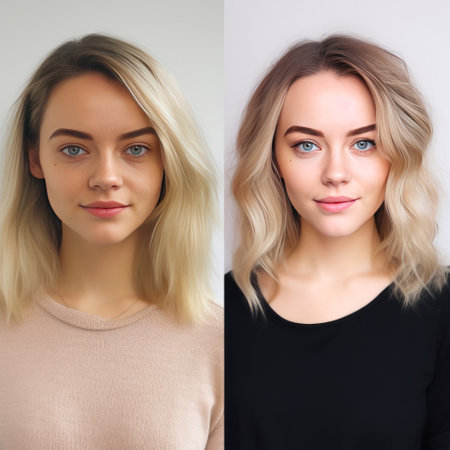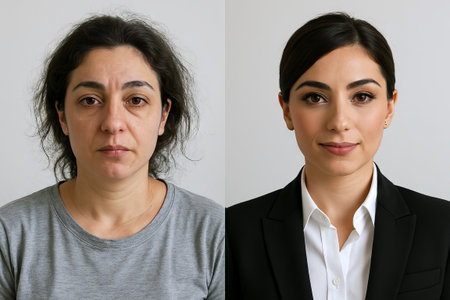 Before and after transformation of woman s image with enhanced appearance and professional attire. concept of personal transformation, professional image, self-improvement.