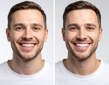 Before-and-after photo composition of a dental whitening treatment. Left side shows natural stained teeth, right side shows the same person with white polished teeth.