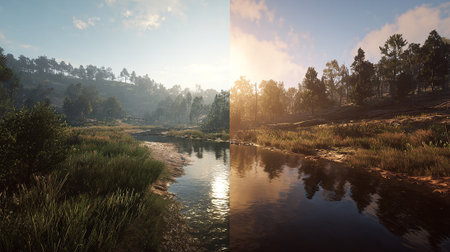 River Scene Split: Comparing Before and After Post-Processing Photography Styles