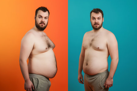 Man's health transformation depicted in before and after images, showing weight loss