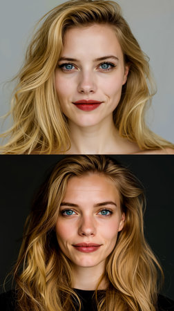 Captivating dual portrait showcasing a woman with stunning features and contrasting backgrounds, highlighting her glamorous makeup and stylish hairstyles in professional photography.