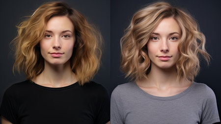 Hair transformation: Before and after photos of a woman on a neutral gray background. Concept Hair Transformation, Before and After, Woman, Gray Background, Beauty Shots