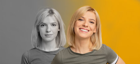 Before and after portrait of a young woman