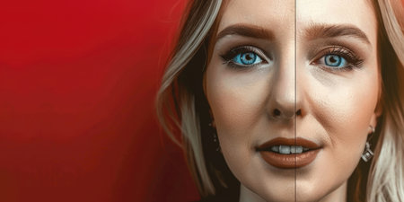 Split-screen photo of a woman face divided into two halves.Aging process created with generative AI technology