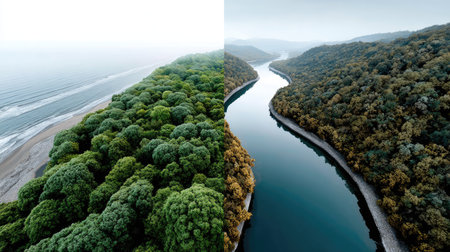 Captivating aerial perspective of a vibrant forest alongside a meandering river, complemented by a serene seashore. Perfect for nature enthusiasts.