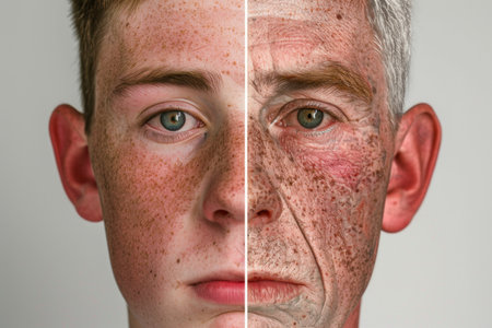 Split portrait of young and elderly caucasian man for concept of aging, AI generated