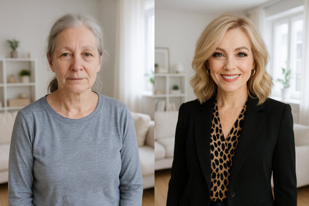 Transformation of mature woman into elegant professional with chic blonde hairstyle in a modern living room. concept of stylish makeover, confidence boost, fashion enhancement.