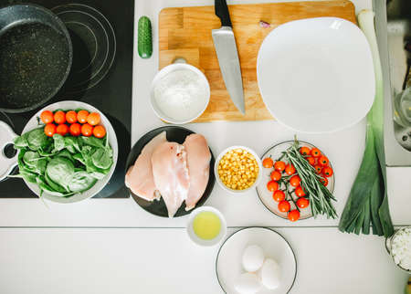 Top view of kitchen table. ingredients for cooking meal