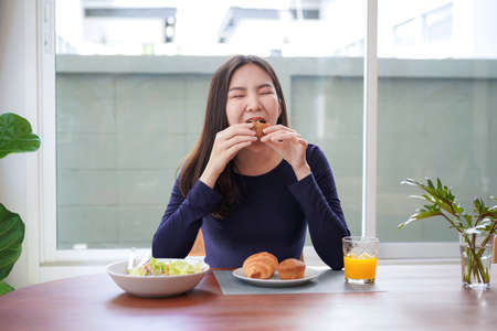 Young asian woman eating bread with a glass of fresh orange juice and healthy salad while breakfast of wellness lifestyle at home