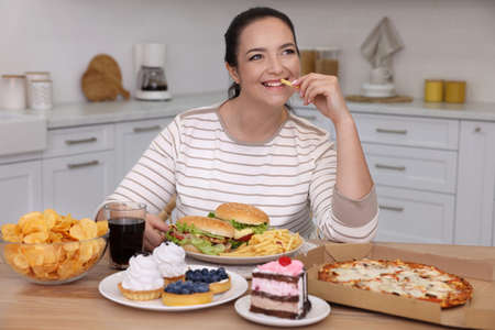 Happy overweight woman eating French fries at table ladened with other unhealthy food in kitchen