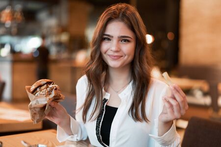 young beautiful woman in white blouse looks hungry holding fresh meat burger in one hand and fries in another during lunch in cafe eating outside