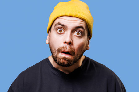 Shocked amazed beared adult guy having astonished full of disbelieve face expression.