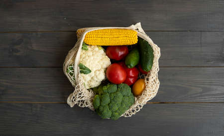 Mesh bag filled with fresh seasonal summer vegetables on dark background. Flat lay.