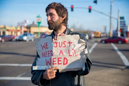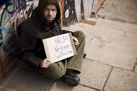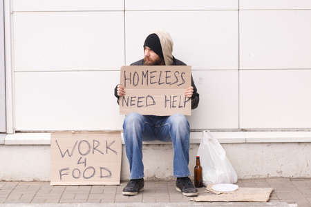 A man, homeless, a person asks for alms on the street with a Help sign. Concept of homeless person, addict, poverty, despair