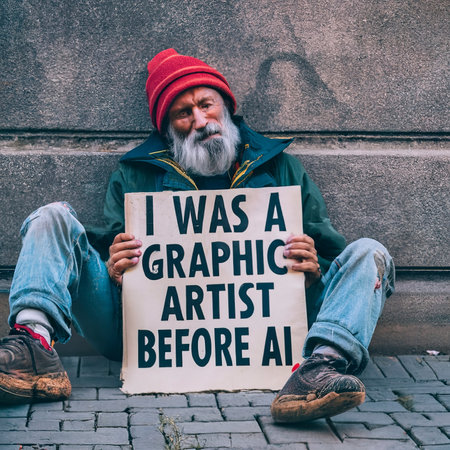 Image of a poor homeless person laying on the ground hold a sign that says - I was a graphic artist before AI