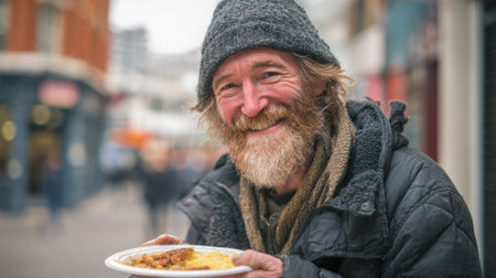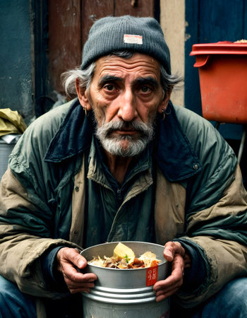 A beanie-wearing elder clutches a meal in humble surroundings, his expression a blend of resignation and strength. The muted colors around him highlight the stark reality of life on the streets.