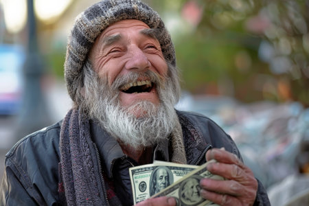 a homeless man joyfully catches money in the air, spreading happiness and laughter.