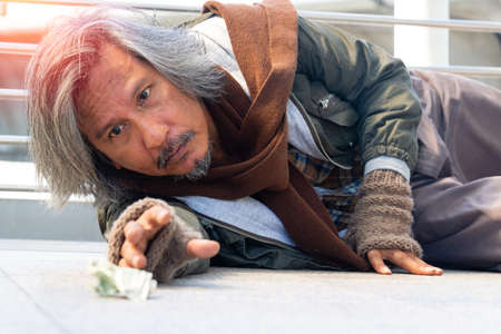 Homeless man is sitting down on walkway in town. He is receive dollar.He is hoping to have the better life. poverty, despair, Photo Sympathetic and hope concept.