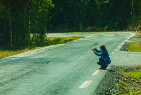 Woman taking pictures on road during traveling in Norway. Picturing nature, forest and trees.