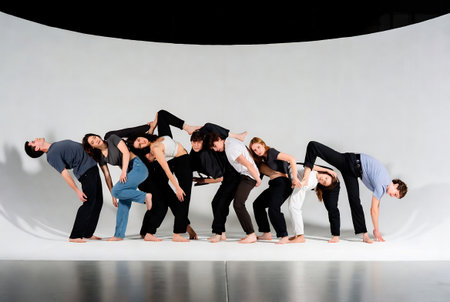 Group of diverse women actively participating in a yoga or fitness class, performing a side stretch with an instructor in a bright, modern studio. Promotes health and wellness.