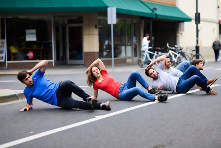 Five individuals performing push-ups on a road surrounded by greenery and trees during what appears to be either sunrise or sunset.