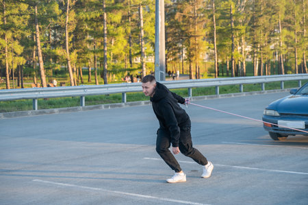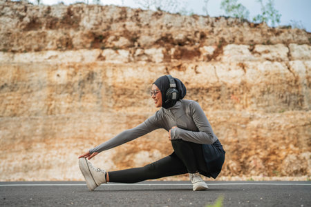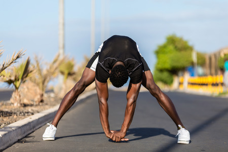 Bodybuilder performing his stretching routine in the morning on an empty road.