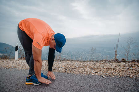 Fit masculine men stretching in the morning and preparing for exercise while looking at the urban city in the valley.