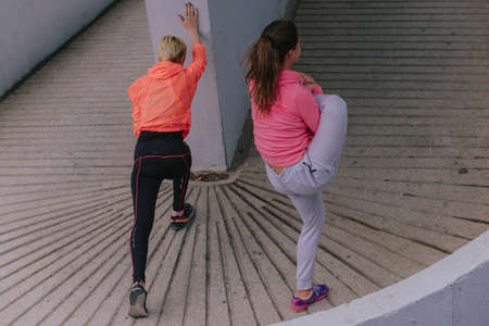 rear view of a Sport two women. Young people women sports exercises together at fitness training outdoor. two girl at sport training together