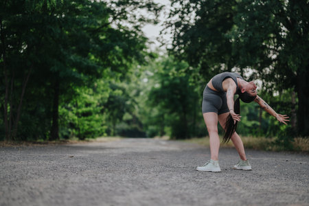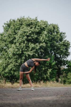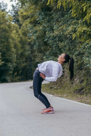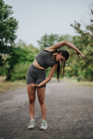 Woman stretching on a park road, wearing athletic clothing, preparing for exercise on a sunny day surrounded by nature.