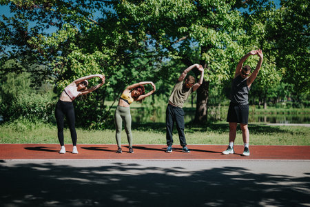 Fit and athletic women enjoying sunny day in city park, engaging in outdoor sports activities, stretching and training together.