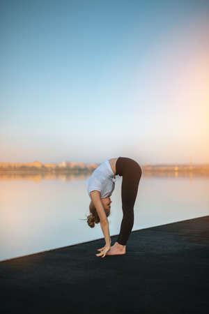 Fitness woman doing exercises of the lungs to train the leg muscles. The active woman stood up to the blue and bent her hands on the floor to loosen her muscles.