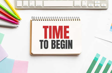 Business concept. Notebook with text TIME TO BEGIN sheet of white paper for notes, calculator, glasses, pencil, pen, in the white background