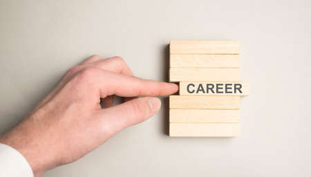 Male hand stacking wooden pegs with career sign one of them in a conceptual image.