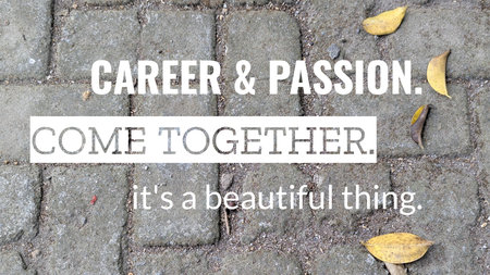 A low-angle photo shows a stone path with fallen leaves. In the center, white text states CAREER and PASSION. COME TOGETHER. it's a beautiful thing. The image suggests a grounded journey.