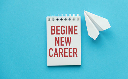 On a blue background, white paper airplane and notebook with the text BEGINE NEW CAREER