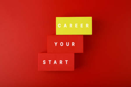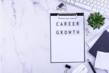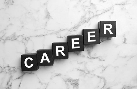 Career growth concept with letters on cubes. Still life of office workplace with supplies. Flat lay vintage wooden desk with computer keyboard and leather wallet. Professional human resources hiring