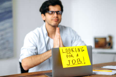 A clever guy, student or unemployed, sits at a table, looking for a job on the net, looks at advertisements, hopes to get a dream job, on a laptop a sign with the inscription looking for a job