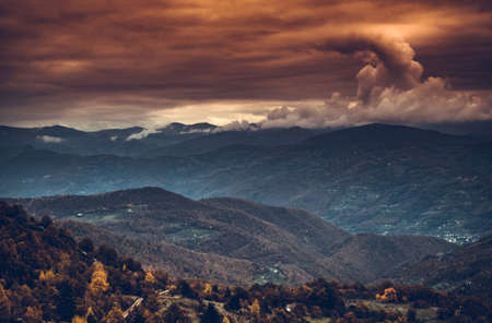 Mountain landscape with a village in the middle of the forest. Serbia, Zlatibor