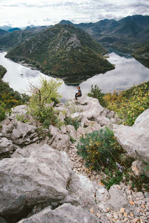 Young woman sitting on cliff's edge and looking to beautiful view