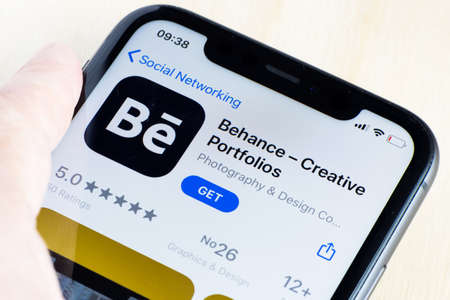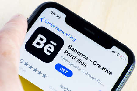 Behance application on Apple iPhone X smartphone screen close-up. Behance application.