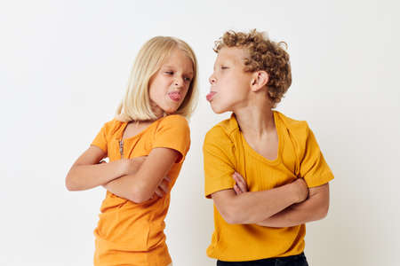 Cute stylish kids in yellow t-shirts standing side by side childhood emotions light background unaltered