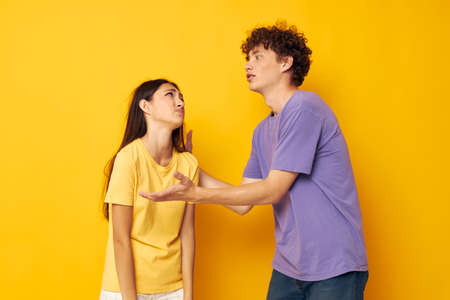 A girl and a guy on a yellow background. A young couple discuss work issues. An office with bright yellow walls.