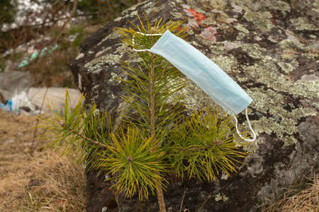 Mask. Discarded used medical masks. Coronavirus NCOV-19 contributes to environmental pollution. Environmental problem after the corona virus epidemic.