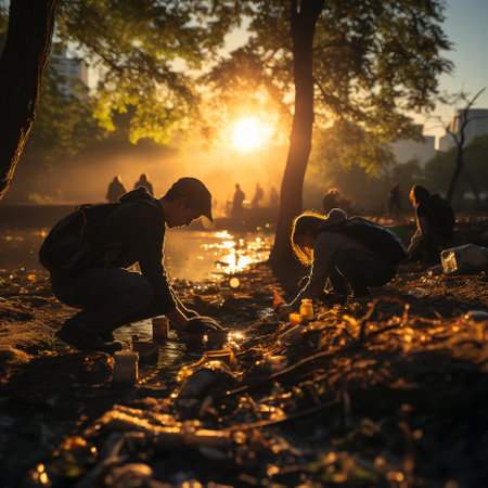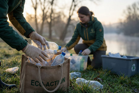 Volunteers wearing gloves collect plastic bottles outdoors near river at sunset, sorting waste for recycling in eco friendly activity. Concept of environment care and sustainable lifestyle.