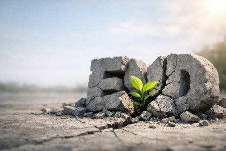 A green sprout makes its way through the shattered concrete word END. Space for text